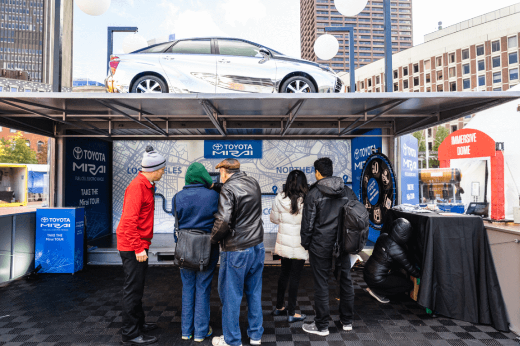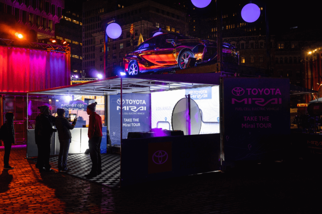 The Toyota Mirai Experience was an interactive augmented reality (AR) exhibit hosted at Boston’s Hubweek Fall Festival in 2018. Developed using Unity and Vuforia’s AR framework,  trade show attendees would use an iPad Pro to project a miniature Toyota Mirai onto the large Boston map in front of them on the shipping container exhibit wall. Then, they could drive the car around on the map with on-screen thumb controls to various map locations. Each location helped them learn about the Toyota Mirai’s features and innovative hydrogen fuel cell technology.
